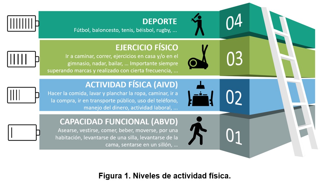 Usualmente se utilizan indistintamente los términos actividad física, ejercicio y deporte, pero hay que diferenciarlos, ya que no son lo mismo, y cada uno supone requerimientos energéticos diferentes: la actividad física se define como cualquier movimiento corporal producido por los músculos esqueléticos que produzca un gasto energético mayor al existente en reposo [6] [7]. El ejercicio físico correspondería a toda aquella actividad física planificada, estructurada y repetida, cuyo objetivo es adquirir, mantener o mejorar la condición física [8] [9], y deporte se define por la Real Academia Española como una actividad física ejercida como juego o competición, cuya práctica supone entrenamiento y sujeción a normas. De manera que la capacidad funcional correspondería al nivel energético mas bajo, seguido de la actividad física, incrementando los niveles energía y gasto calórico, el grado, intensidad y frecuencia en que se realice ejercicio físico, y por último el deporte es el que más energía y gasto energético precisa (Figura 1).