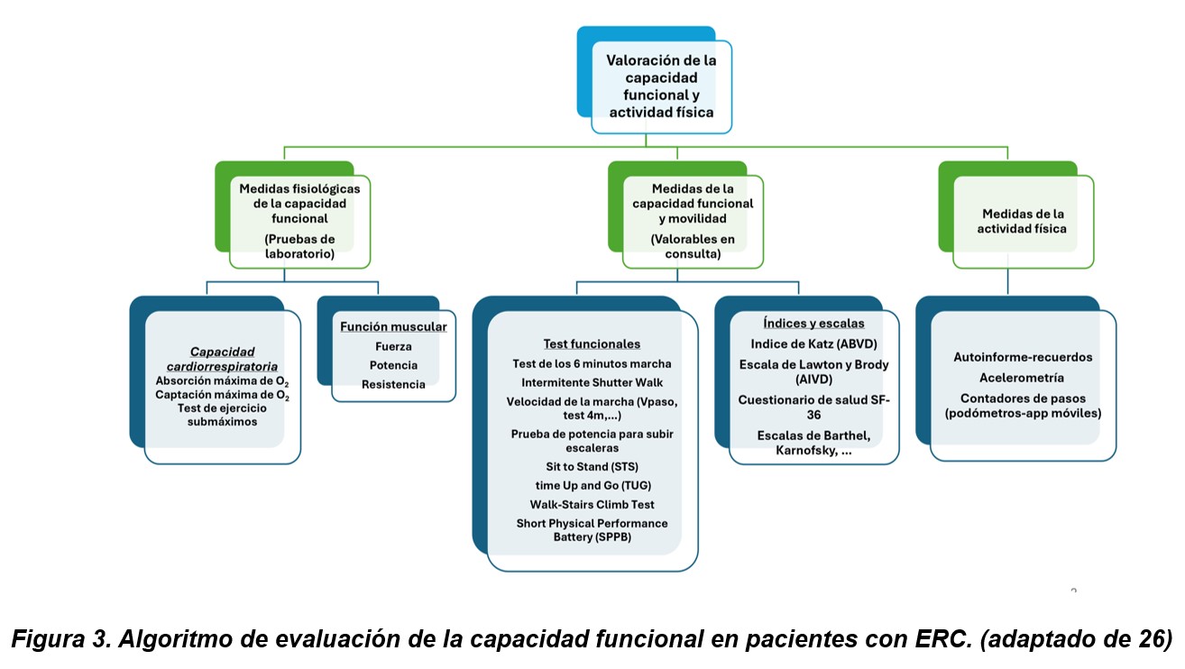 Hoy en día, no existe un consenso de cómo se debe evaluar la capacidad funcional en los pacientes con enfermedad renal crónica, pudiendo encontrar diferentes propuestas en los diferentes trabajos publicados, tampoco está establecido en qué momento o quien debe de realizar esta valoración funcional.