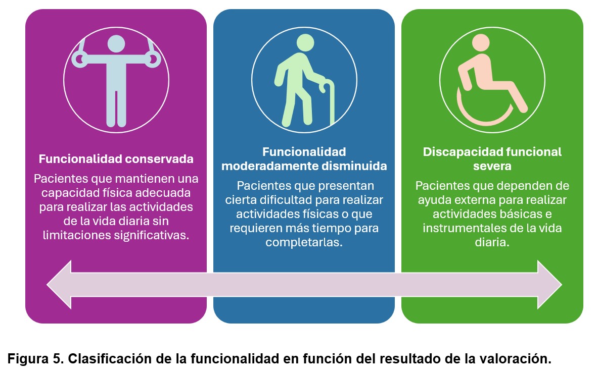 La clasificación de la funcionalidad se basa en los resultados de los test descritos previamente y aunque cada test tiene su clasificación y graduación de la funcionalidad, se podrían agrupar en las siguientes categorías (Figura 5):