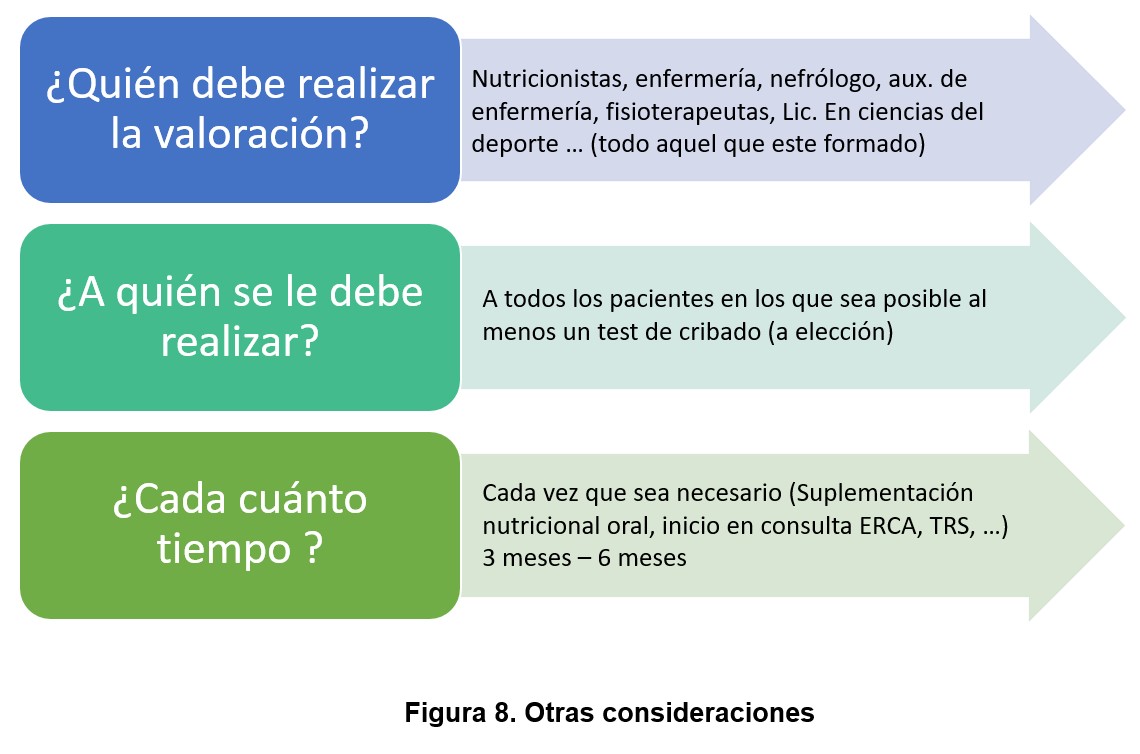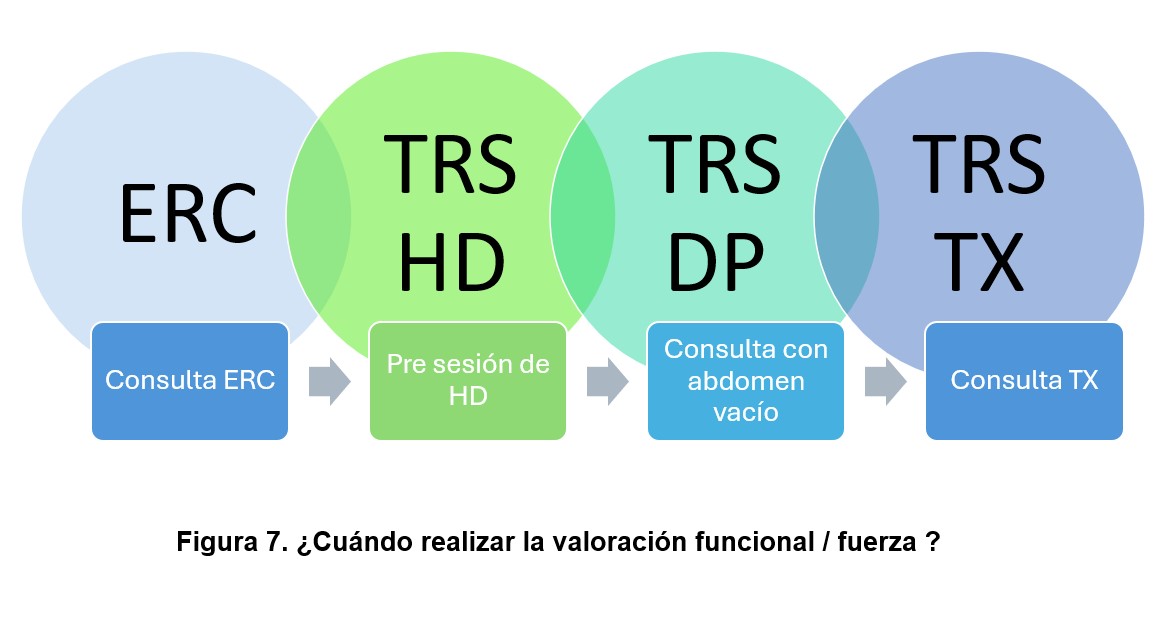 En función de la situación que presente el paciente (ERC, ERCA, TRS, trasplante, tratamiento conservador) se podría realizar la valoración en consulta, o en una consulta especifica. En el caso del TRS en hemodiálisis se debería realizar antes de la sesión de HD, ya que después de la misma, tanto la fuerza como la funcionalidad disminuyen [65] [66] y en el caso de diálisis peritoneal debe realizarse con el abdomen vacío si la prueba es muy intensa (fuerzas máximas, saltos, etc.) [67].