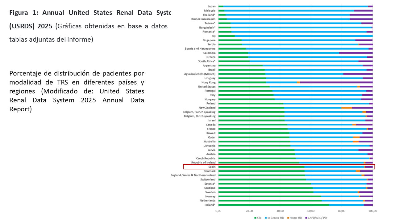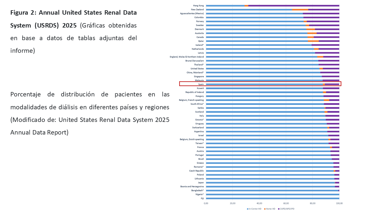 El uso de la DP en el mundo es muy variable con importantes fluctuaciones entre los distintos países y regiones. En la (Figura 1) se muestran los datos a nivel mundial recogidos en el registro americano correspondiente a información del año 2023 relativas al uso de DP en la población en TRS y en la (Figura 2), la distribución de pacientes en diálisis, oscilando entre una prevalencia de más del 50% en algunos países frente a otros inferiores al 5% [1].