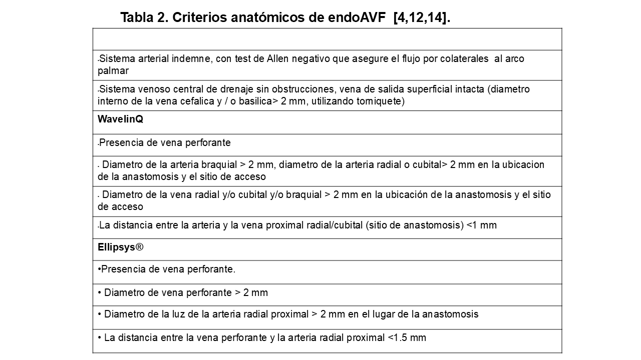 No candidato a AVFr-c o con AVFr-c previa no funcionante. Es importante destacar que la creación de una endoAVF no impide la posibilidad de realizar una AVF radiocefálica distal en el futuro si fuera necesario.