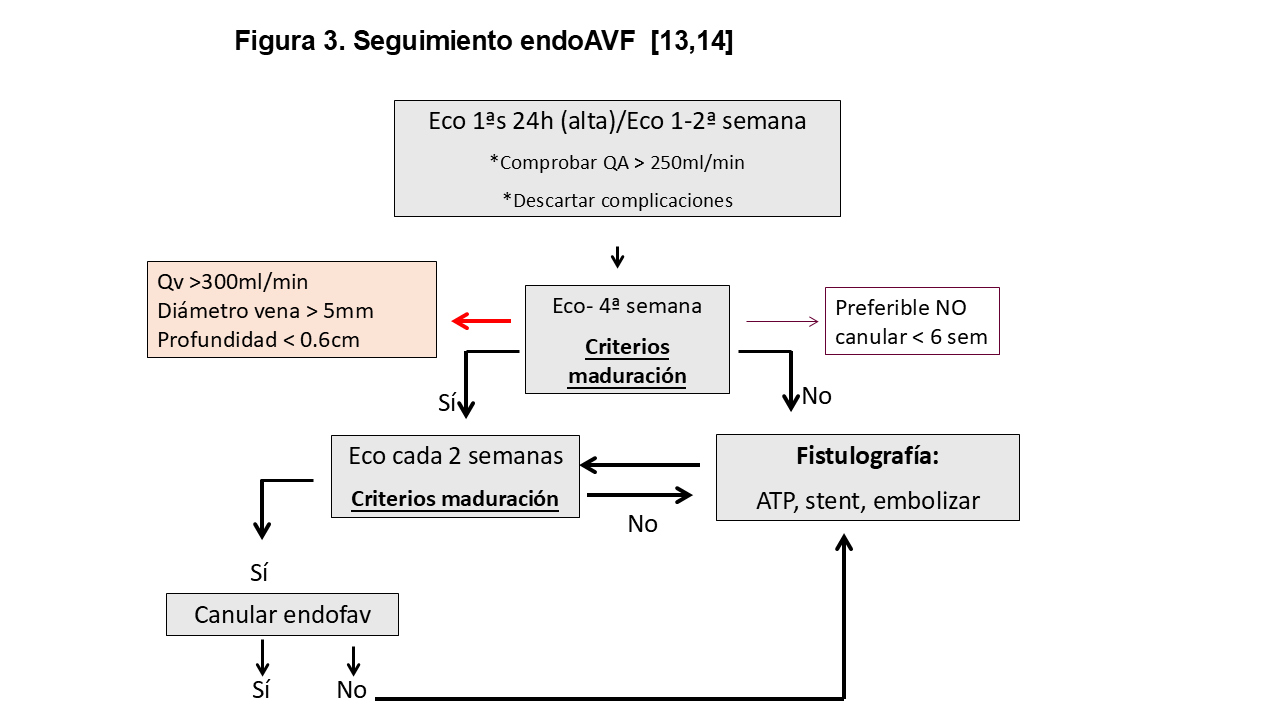 Para alcanzar estos criterios, es frecuente que las endoAVF requieran procedimientos adicionales, durante su creación, como la embolización de venas colaterales para redirigir el flujo hacia las venas superficiales, especialmente en el sistema WavelinQ o angioplastias de la anastomosis, especialmente en el sistema Ellipsys.
