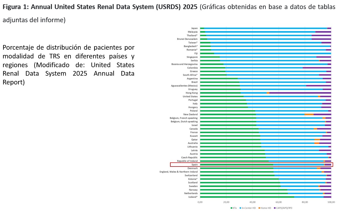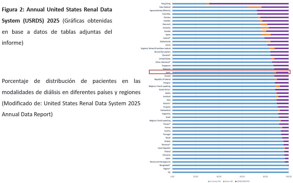 El uso de la DP en el mundo es muy variable con importantes fluctuaciones entre los distintos países y regiones. En la (Figura 1) se muestran los datos a nivel mundial recogidos en el registro americano correspondiente a información del año 2023 relativas al uso de DP en la población en TRS y en la (Figura 2), la distribución de pacientes en diálisis, oscilando entre una prevalencia de más del 50% en algunos países frente a otros inferiores al 5% [1].