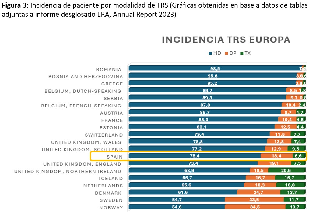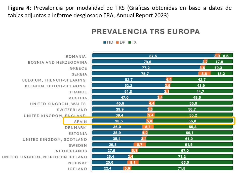 En Europa, la situación es similar, existiendo países como Suecia o Noruega en los que más de un 30% de los pacientes que inician TRS lo hacen con DP, mientras que en otros países como Rumania, el uso de la DP es prácticamente inexistente [2]. Las (Figura 3) y (Figura 4) muestran los últimos datos disponibles del registro europeo de la European Renal Association (ERA) de 2023 en cuanto a incidencia y prevalencia de modalidades de TRS por países.