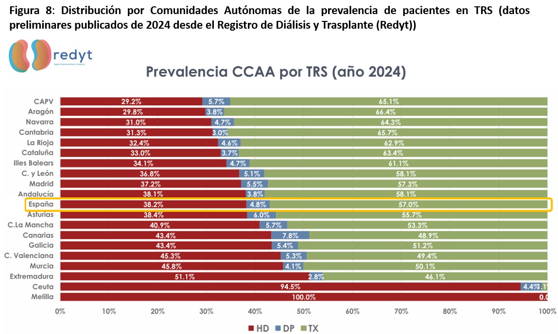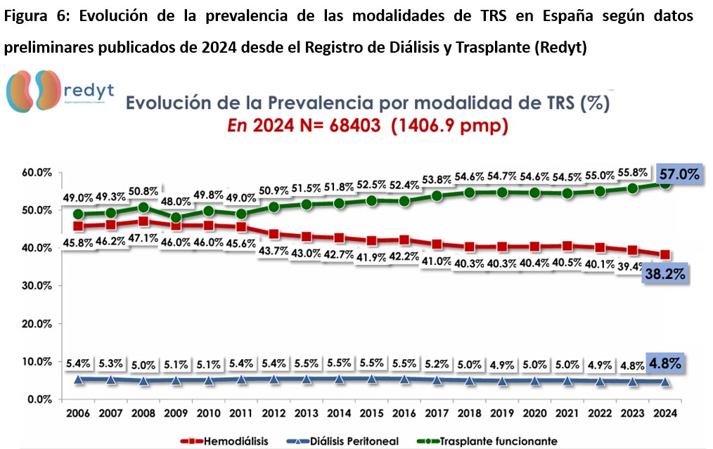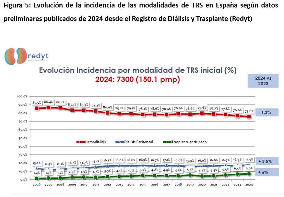 Las opciones actualmente disponibles de tratamiento renal sustitutivo (TRS) para pacientes con enfermedad renal crónica avanzada (ERCA) incluyen el trasplante renal (TR), la diálisis peritoneal (DP) y la hemodiálisis (HD). El TR, especialmente de donante vivo, es la terapia de elección porque ofrece los mejores resultados clínicos y es la modalidad más coste eficiente. Sin embargo, en nuestro entorno la mayoría de los pacientes tienen que iniciar TRS mediante la diálisis por no ser suficiente el número de órganos disponibles para TR.