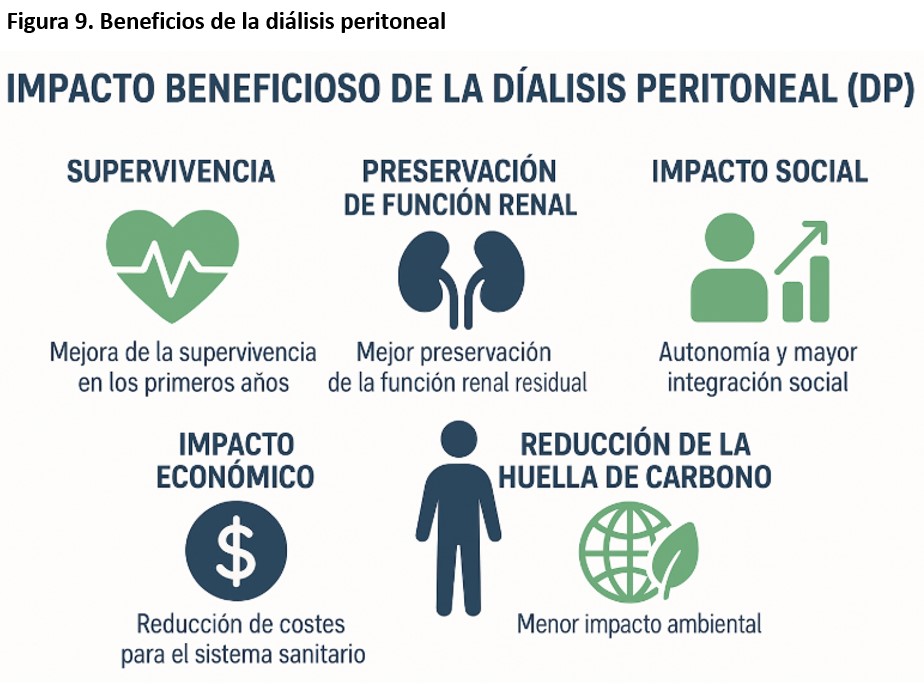 En la última década, ha habido un interés creciente en los tratamientos de diálisis domiciliaria, favorecido por la creciente evidencia de que esta terapia representa una alternativa importante a la HD en centro; es coste eficiente, ambientalmente sostenible, mejora la preservación de la función renal residual y está centrada en el paciente y su autocuidado, ofreciendo resultados beneficiosos especialmente en relación con la calidad de vida y la supervivencia [8][9][10] (Figura 9).