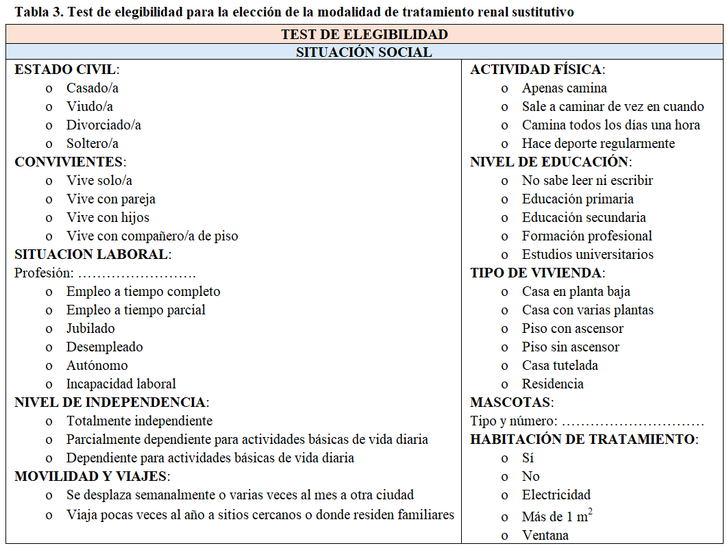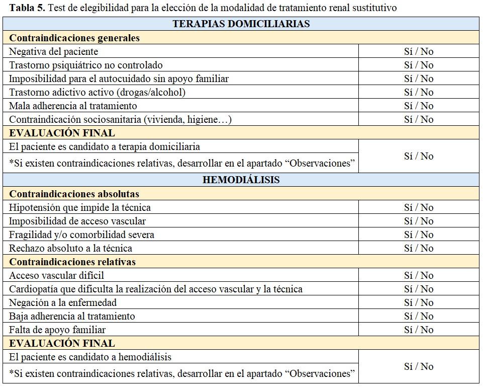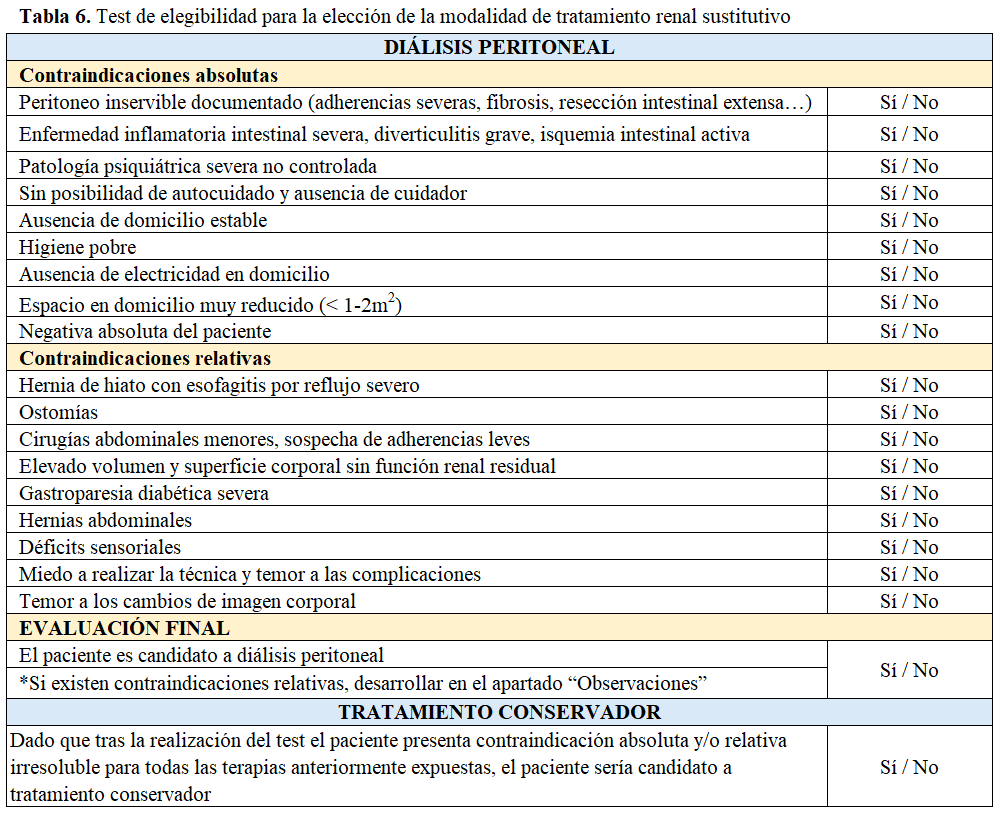 Los programas de información, educación y apoyo a pacientes/familiares, que tienen que elegir una modalidad de TRS, son imprescindibles para garantizar que la elección se hace libremente y que se adapta a las necesidades y valores de la persona. El modelo de toma de decisiones compartida se está imponiendo como una herramienta útil para facilitar esta elección. Este proceso comprende tres etapas consecutivas: información global, presentación de opciones y consenso sobre la mejor opción de tratamiento disponible [47]. El modelo de Acreditación de Calidad de las Unidades ERCA (ACERCA) de la Sociedad Española de Nefrología (S.E.N.) de medida de estándares de calidad para mejorar la atención de los pacientes y el funcionamiento de las unidades de ERCA establece que previamente al proceso de información, deliberación y elección de la modalidad de TRS, se debe realizar una prueba de elegibilidad para valorar las contraindicaciones médicas y sociales, absolutas y relativas de cada modalidad [47]. Esto es fundamental para que las personas y los profesionales conozcan cuales son realmente las opciones de elección y puedan facilitar el proceso de formación y elección. La (Tabla 3) muestra un ejemplo de test de elegibilidad para la elección de TRS y la (Tabla 4) para la posible opción de trasplante renal de donante vivo. La (Tabla 5) presenta un test de elegibilidad entre hemodiálisis y diálisis domiciliarias y finalmente, la (Tabla 6) muestra un test de elegibilidad para la modalidad de DP.