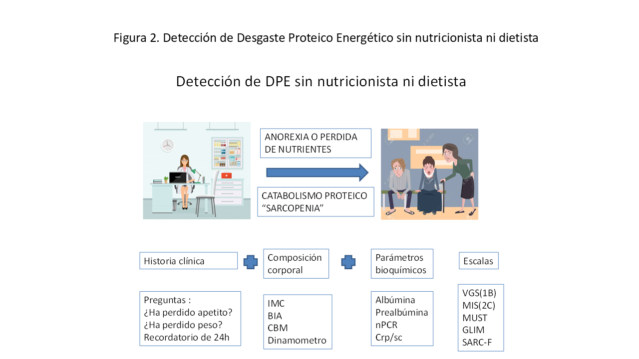 - Para un correcto diagnóstico de DPE se requiere la valoración de marcadores bioquímicos, composición corporal, cálculo de pérdida de musculo e ingesta dietética o escalas rápidas de detección como MUST, GLIM, MIS o VGS.