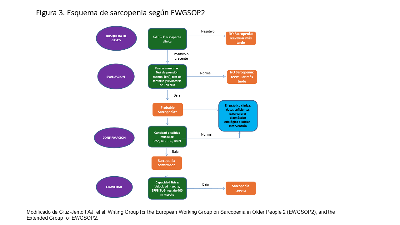 También la importancia del uso del dinamómetro para la valoración de la funcionalidad de la masa muscular. Recientemente un grupo de trabajo de la FRIAT (fundación Renal Iñigo Alvarez de Toledo) analizaron la prevalencia de sarcopenia según los criterios del Grupo de Trabajo Europeo sobre Sarcopenia en personas en Edad Avanzada (EWGSOP2) [34] (Figura 3) en los pacientes en diálisis. De esta forma cuando se aplicaron los criterios de funcionalidad muscular la prevalencia de sarcopeni ascendía al 78 %, mientras que aplicando los criterios de masa muscular era del 20%. Estos datos ponen en valor la importancia del ejercicio físico para impedir el proceso de sarcopenia [35].