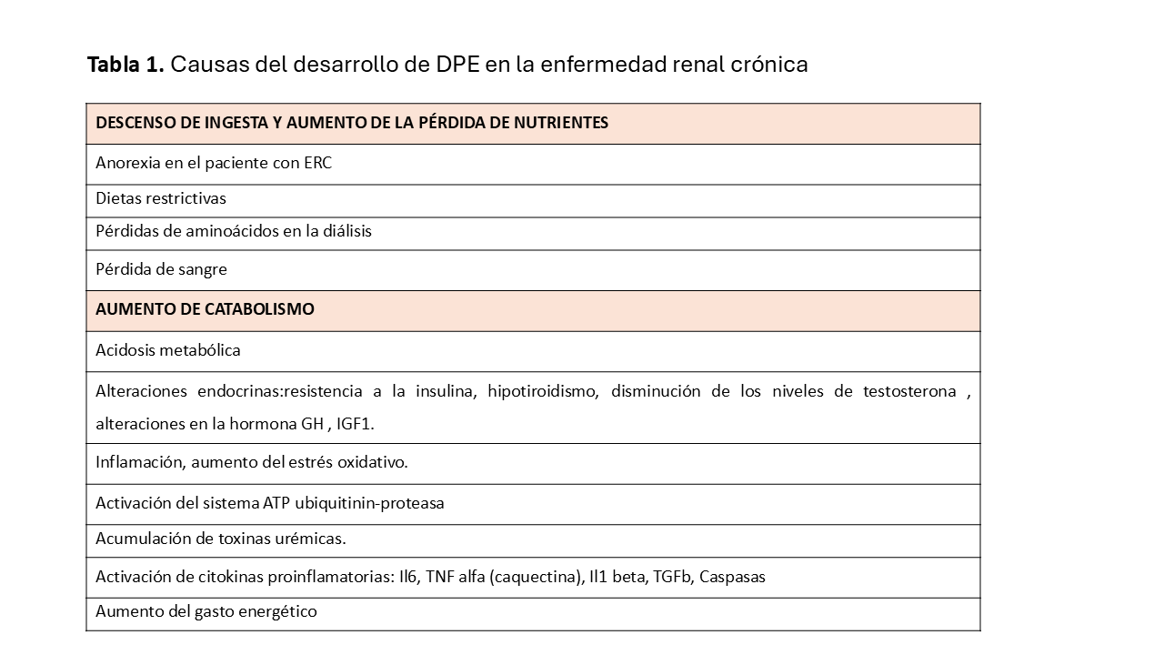 El término de desgaste proteico-energético (DPE) intenta aunar en una sola entidad patológica las múltiples alteraciones nutricionales y catabólicas que acontecen en la enfermedad renal crónica y que conlleva la pérdida gradual y progresiva tanto de masa muscular como grasa. Es un síndrome común en los pacientes, especialmente a partir del estadio 4-5. Así, durante la etapa de diálisis, parece estar presente en el 30-60% de los pacientes. Sus implicaciones clínicas son importantes y reclaman un tratamiento rápido y efectivo, pues DPE se asocia a un incremento de la mortalidad tanto global como cardiovascular, número de infecciones e ingresos, y otras muchas comorbilidades. Su efecto devastador origina paradojas epidemiológicas que se explican por la competitividad entre los factores de riesgo a corto y a largo plazo.