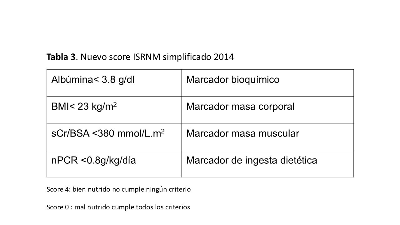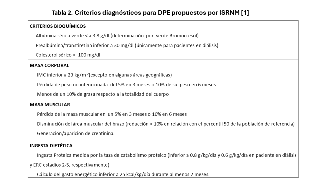 Aunque cada vez más en las unidades de ERCA y diálisis están incluyendo personal especializado en valoración y detección de malnutrición, la realidad en la práctica clínica es que el nefrólogo se encuentre solo y tiene que ser quien detecte y realice dicha valoración y seguimiento, para lo cual recomiendan la utilización de herramientas como marcadores bioquímicos, antropométricos e ingesta dietética muy similares a los criterios de Desgaste proteico energético de la ISRNM (Figura 2).