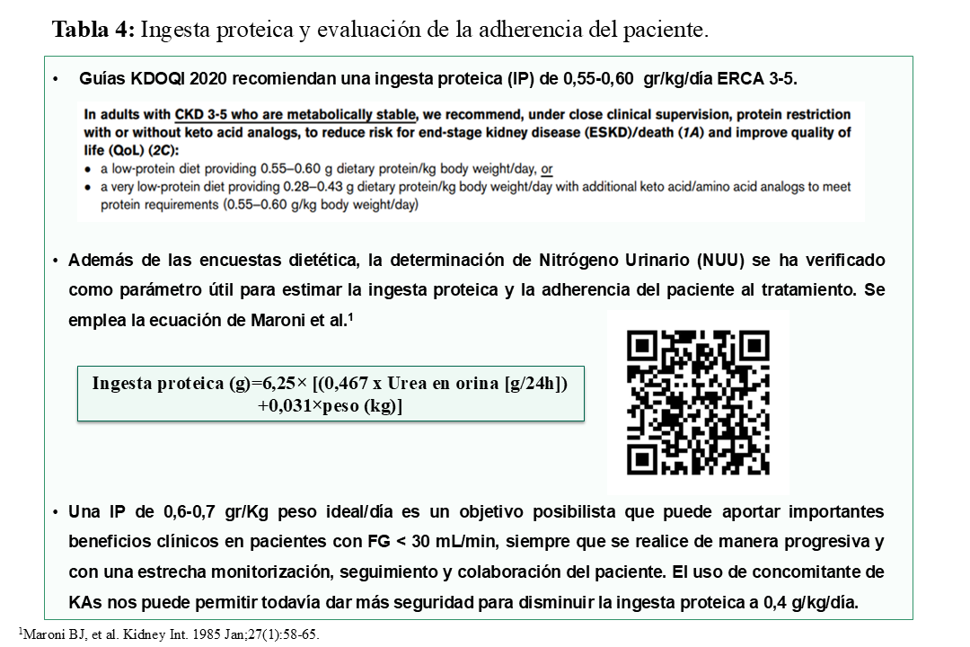 Sin embargo, la ausencia de nutricionista no debe suponer una excusa para no asesorar nutricionalmente a las personas con ERC. Una alternativa para aquellos centros -la mayoría en España- en los que no se dispone de nutricionista, puede ser la realización de enfoques simplificados y prácticos para la prescripción de la restricción proteica [93] [94]. De hecho, incluso reducciones modestas en la ingesta proteica, de tan solo 0,2 g/kg/día, podrían retrasar la necesidad de iniciar diálisis [16] [95]. En estas unidades ERCA sin nutricionista, la ingesta proteica puede estimarse mediante la excreción urinaria de nitrógeno ureico, mientras que el peso corporal y otros métodos antropométricos como el diámetro de la pantorrilla o como la dinamometría de mano, así como la utilización periódica de la bioimpedanciometría pueden ser útiles para monitorizar el estado nutricional de los pacientes [93] [96]. En la (Tabla 4) se detalla cómo valorar la adherencia a la ingesta proteica a partir de la orina de 24h, así como un link a una APP para facilitar su cálculo a partir del peso real y la urea en orina de 24h del paciente [97] [98]. Una IP de 0,6-0,7 gr/Kg peso ideal/día es un objetivo posibilista que puede aportar importantes beneficios clínicos en pacientes con FG < 30 mL/min, siempre que se realice con una estrecha monitorización y colaboración del paciente, y se implemente progresivamente de manera escalonada, con un descenso progresivo de la ingesta de proteínas de 0,2 gr/Kg/d a lo largo de al menos tres visitas [99] [100]. El uso de concomitante de KAs -recientemente introducidos en España- nos puede permitir todavía dar más seguridad para disminuir la ingesta proteica a 0,4 g/kg/día [101].